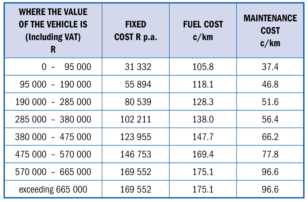 - Using actual business expenditure (The value of the vehicle is limited to R665 000 for purposes of calculating wear and tear, which must be spread over seven years, while finance costs are also limited to a debt of R665 000. For a leased vehicle the instalments in a year of assessment may not exceed the fixed cost component in the table), or